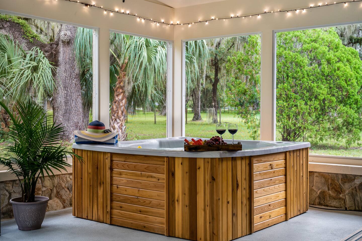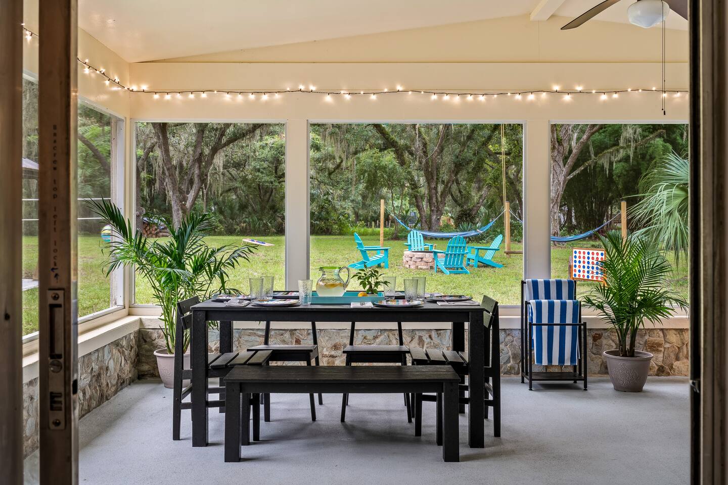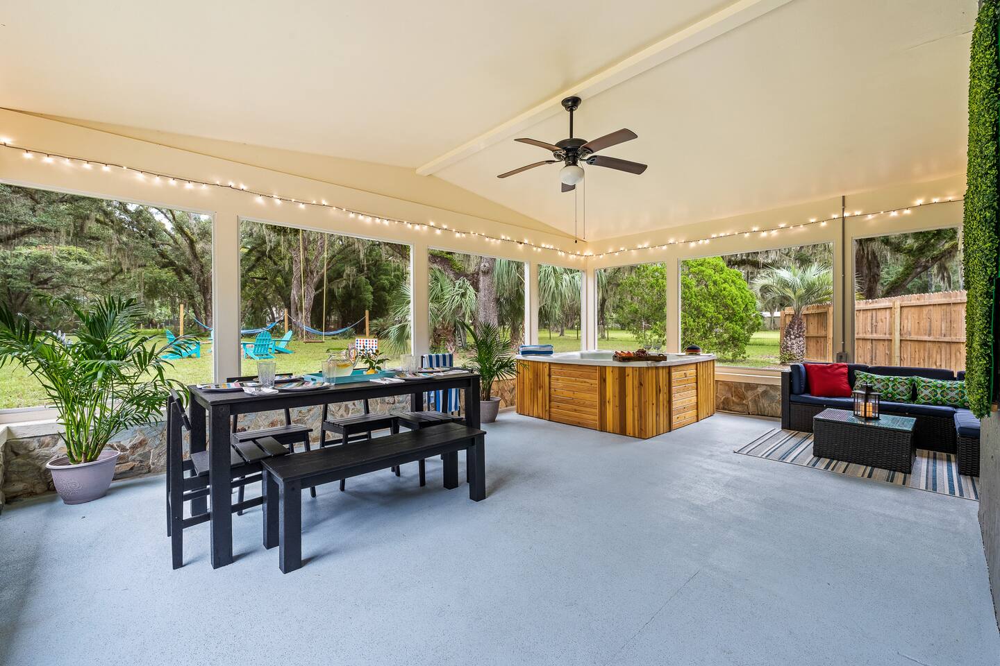 Designed for your relaxation, Whispering Oaks Retreat is the perfect blend of comfort and adventure. Wake up beneath century-old oaks, sipping your morning coffee in the screened patio where you can lounge, dine outdoors, or slip into the bubbling hot tub. (If you’re an early riser—or a night owl—keep watch for deer, often spotted wandering quietly across the property at dawn or after dark). Spend the day your way—challenge each other in the game room with pool, foosball, arcade basketball, and a 65” TV, or head outside to hammocks, a swing, and yard games like volleyball, cornhole, and giant Jenga that spark laughter and connection. As evening falls, grill under the gazebo, roast s’mores by the fire pit, and gaze up at a blanket of stars. When it’s time to rest, retreat to the primary suite with a plush King bed, or settle into the guest room with a Queen and twin bunks—each room featuring blackout curtains for a restful night’s sleep. With boat ramps, springs, and manatee tours just minutes away, every day is a chance to explore and return to your private getaway. Save Whispering Oaks Retreat to your favorites and book your Crystal River escape today—your unforgettable getaway is waiting. **Optional add-ons; to further enhance your stay include half day stay, early check-in or late check-out (when available), EV charger activation, and a pet add-on for up to two dogs <65Lb—all available for a small charge.** Nearby Tourist Attractions: ➡️ 3 Sisters Spring (swim with Manatees)- 12 min ➡️ King’s bay-12 min ➡️Hunters Park (Swimming & kayak)- 11 min ➡️Fort Island Trail (Scalloping)- 20 min ➡️Homosassa Springs Wildlife Discover endangered animals including manatees all year long- 24 min ➡️Crystal River National Wildlife Refuge- 14 min ➡️Church house Hammock Trail-Boardwalk trail in the Crystal River Preserve featuring scenic marshes & native wildlife- 8 min ➡️Rainbow Springs-tubing down the river, kayaks, and much more- 28 min The Property INDOOR: ➡️2 Large bedrooms w/ TVs ➡️Gourmet Kitchen ➡️Fully Equipped Kitchen. ➡️ Washer & Dryer ➡️ 5G WIFI ➡️2 Bathrooms ➡️Spacious Living Room ➡️Inside/Outside Dining ➡️Designated Work Station GAME ROOM: ➡️Pool Table ➡️Foosball ➡️Dart Board ➡️ 65" TV ➡️ Kids Table ➡️Arcade/Basketball Game ➡️Table Board Games ➡️Books & Toys OUTDOOR: ➡️Propane Gas Grill ➡️Hot Tub ➡️ Outdoor Shower ➡️Corn Hole Games ➡️ Hammocks ➡️Volleyball ➡️Huge Backyard ➡️Fire Pit ➡️Fire (Gas) Table ➡️Outdoor Furniture ➡️Giant Jenga ➡️Giant Connect Four ➡️And More... Whether you’re looking for outdoor activities, backyard relaxation, or a break from the daily grind, everything is easily accessible.