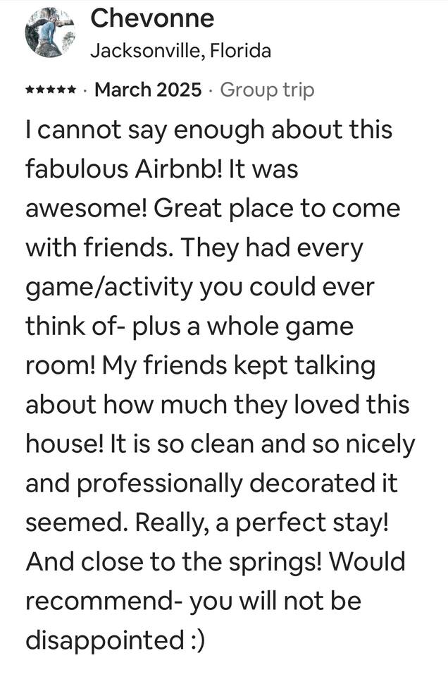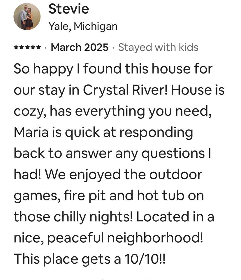 📜 House Rules – Crystal River Oaks Retreat ⏰ Check-In / Check-Out Check-in: 4:00 PM or later Check-out: 10:00 AM Early check-in / late check-out available upon request (extra fee may apply). 🎉 No Parties or Events Gatherings limited to registered guests only Quiet hours: 10:00 PM – 8:00 AM 🐾 Pets Up to 2 well-behaved dogs (under ~65 lbs each) allowed with prior approval Please use provided pet supplies (covers, paw towels, bowls, poop bags) No pets in the hot tub 🚫🐶 🚭 Smoking / Vaping No smoking or vaping inside 🚫 Outside only—please use designated containers 💦 Hot Tub Shower before use No food, glass, or pets in/around the hot tub Children must be supervised 👀 Replace the cover after use 🚗 Parking / Vehicles Driveway parking for cars, boats & RVs EV charging station available (usage fee applies) ⚡ No parking on the grass 🗑 Trash & Recycling Pickup: Wednesday mornings Roll bins to the curb Tuesday night & return after pickup 🔥 Fire Pit & Grill Use responsibly, never leave unattended Only provided firewood/charcoal permitted 👨👩👧 Children Must be supervised at all times, especially near hot tub, fire pit & games 🏡 General Care Please respect the house & property Report damages promptly Only registered guests allowed on the property. **For your safety and peace of mind, the house is equipped with a smart video door lock and exterior security cameras. These are located at the front door, in front of the house, on both sides, and in the backyard. They monitor and record activity around entry points, the driveway, and outdoor areas strictly for security purposes. Footage may also be used to verify that the number of guests and pets on the property matches what was registered in the Airbnb reservation. No interior areas are recorded.**